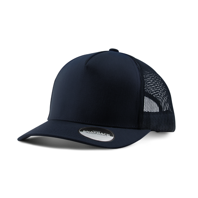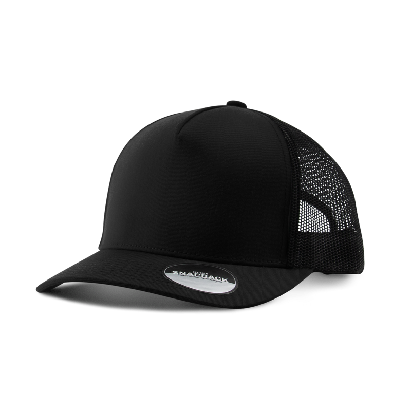 5 panel trucker hat with premium mesh back. Mid profile. Structured. Snapback closure.
