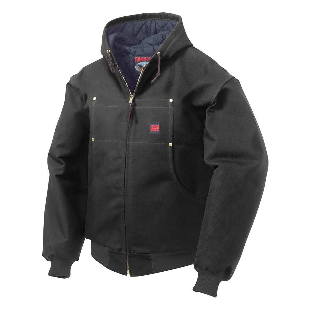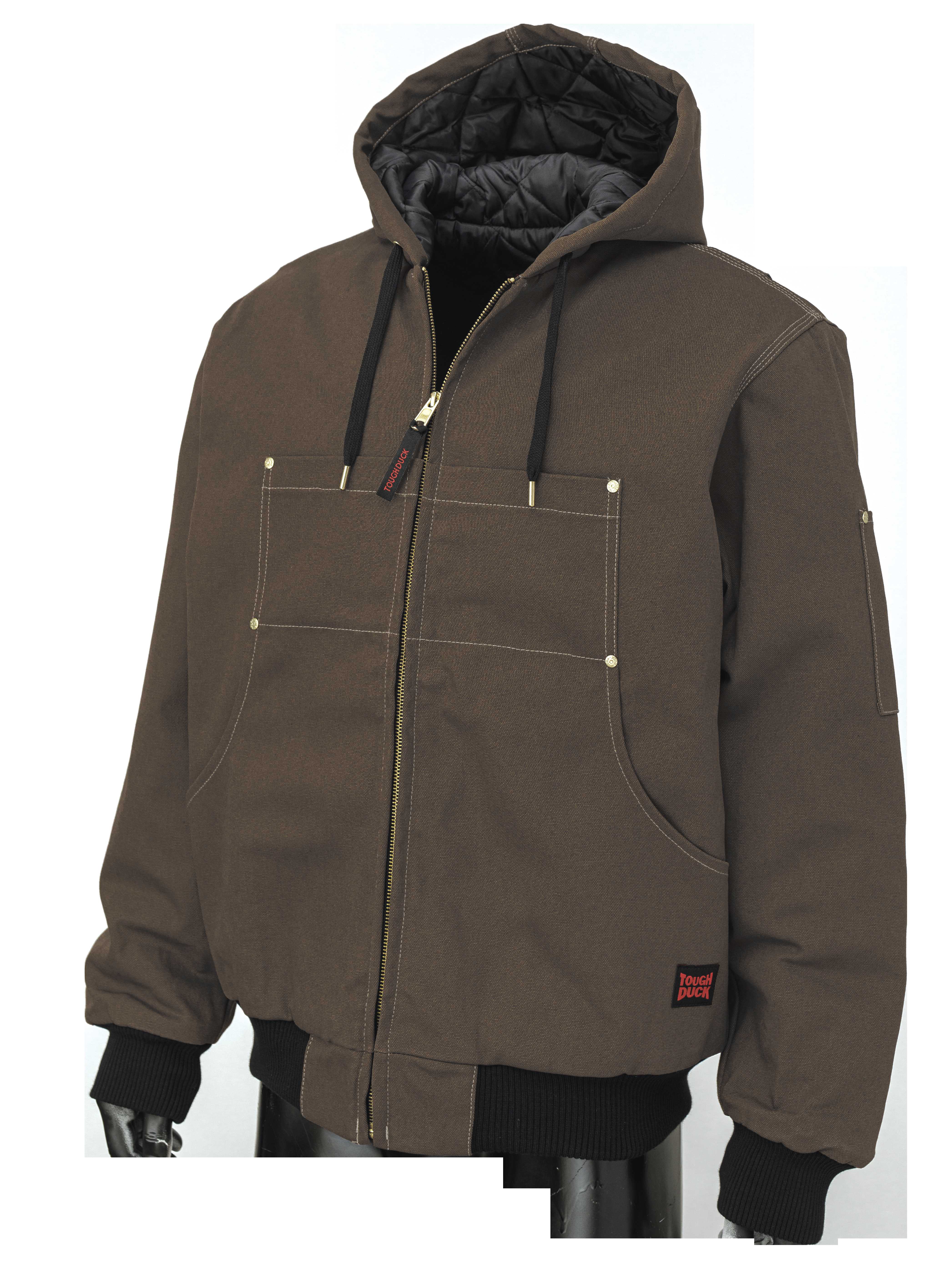 100% cotton, lining: quilted 5oz polyester insulation, 2 chest pockets, 2 front scoop pockets, knit waist and cuffs, attached hood with drawstrings, inside pocket and cell pocket