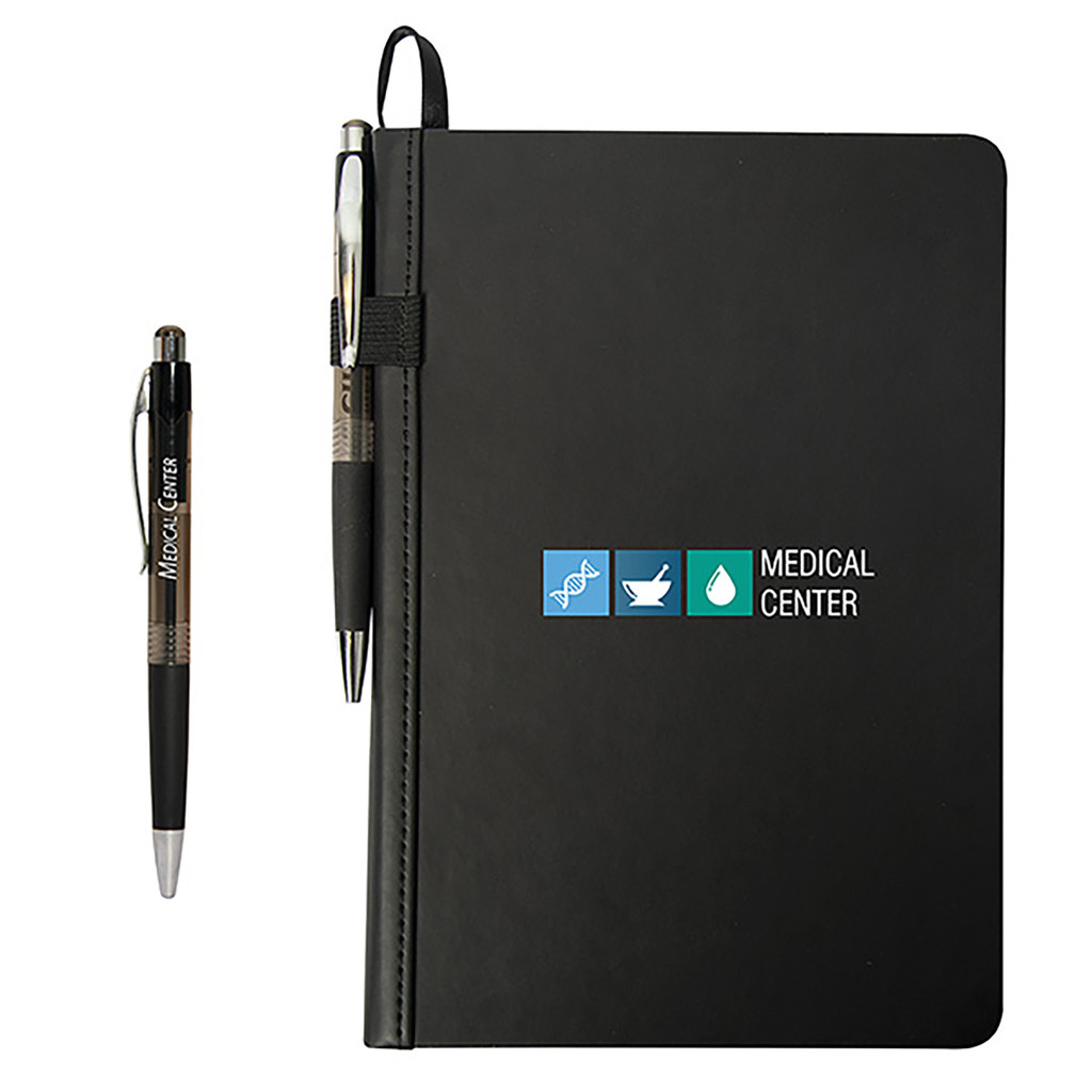 PU coated hard cardboard cover. Matching coloured ribbon bookmark. Elastic pen loop. Pained edge. 96 sheets of 80G lined ivory paper. Includes PE421 Mardi Gras clipper black pen. Set up $65.00 includes 1 location, 1 colour.